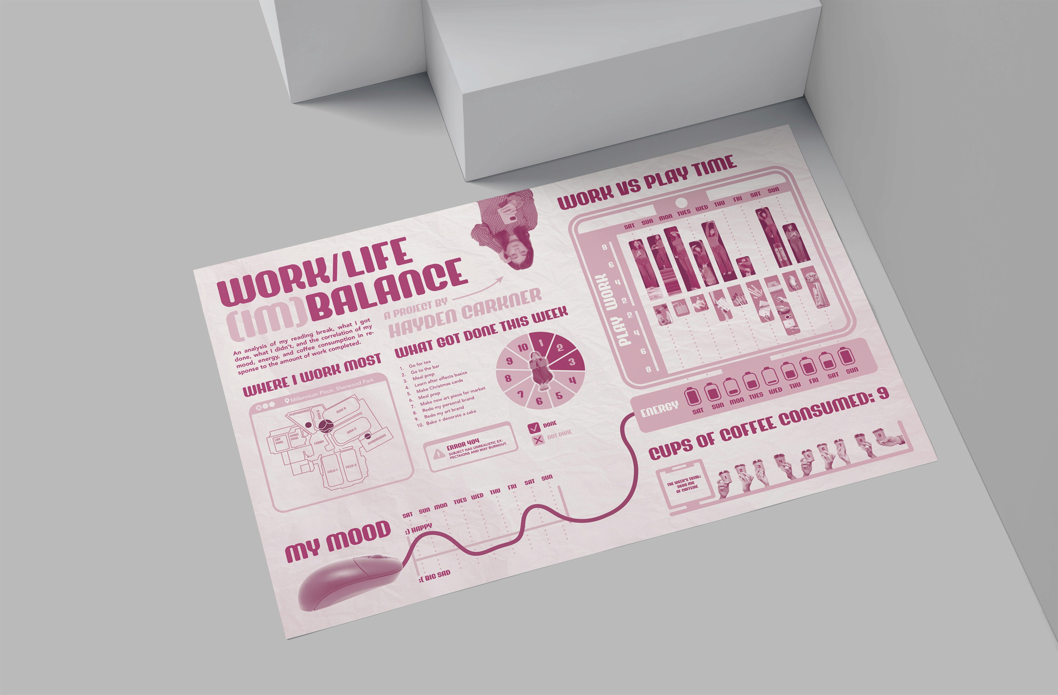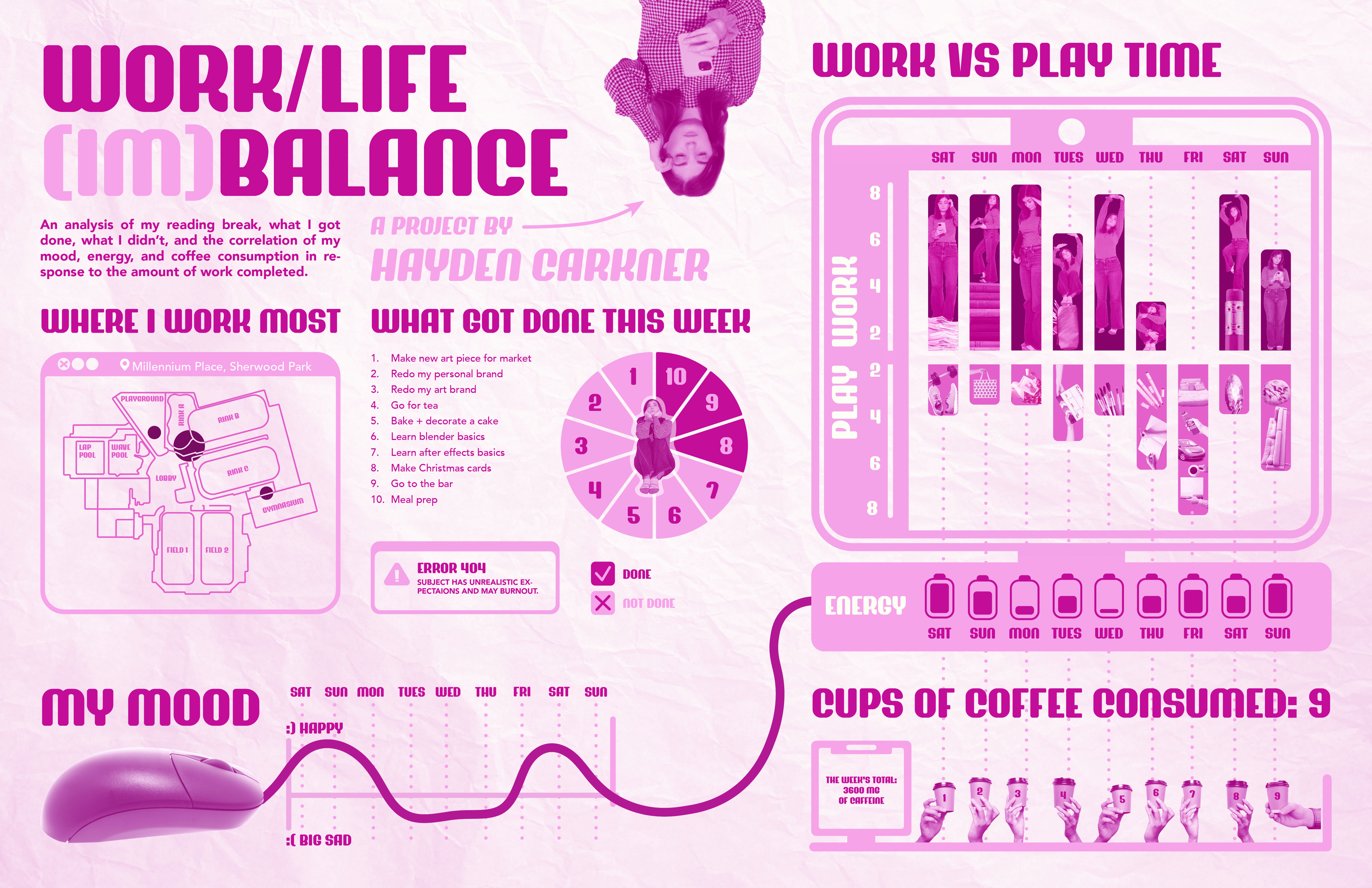 Work/Life (Imbalance) is an informational poster highlighting how much time I spent in and out of work during my fall reading week of 2024. As my final Information Design class project, I decided to challenge myself by using various mediums such as photography to build a poster people would be inclined to read.